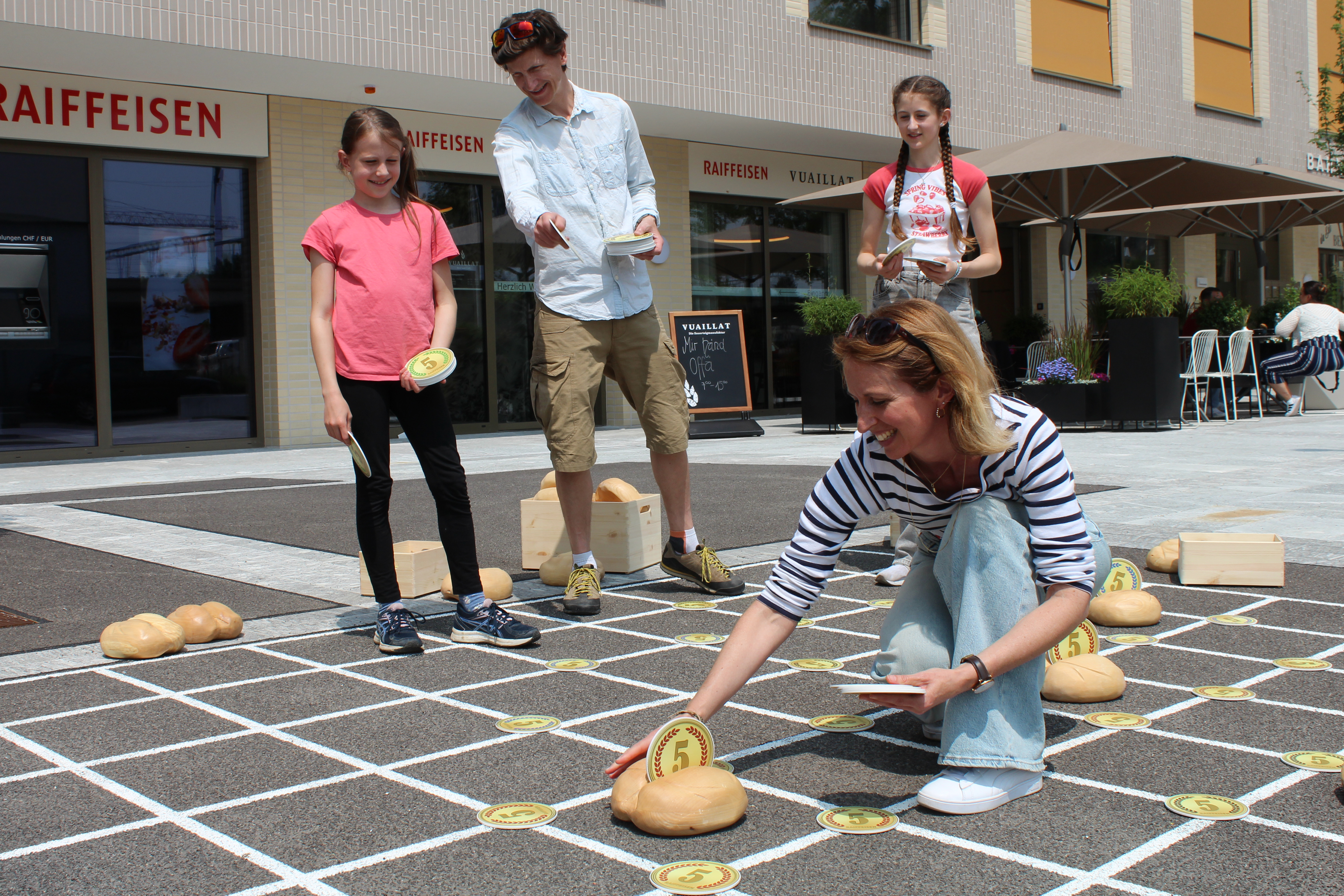Bei der Bank- und Bäckerei-Filiale beim Bahnhofplatz setzen die Spielerinnen und Spieler sogleich den «Foifer und s Weggli» zusammen.